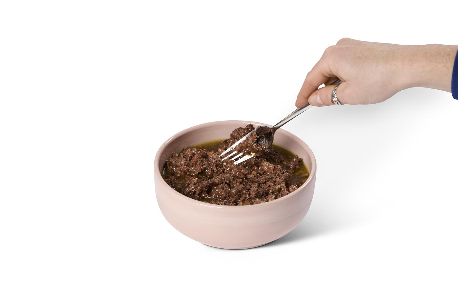 Schütten Sie den gesamten Inhalt in ein Gefäss, vermengen Sie die Flüssigkeit gründlich mit dem Fleischkern und portionieren Sie anschliessend die gewünschte Menge für Ihren Liebling.