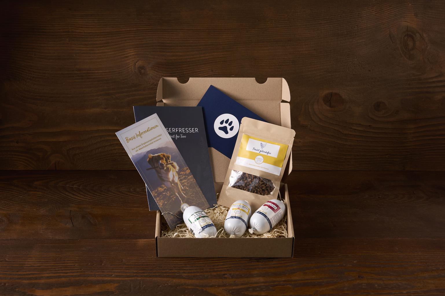 Diese Box verleiht Ihnen einen kleinen Einblick in unser Produktesortiment. Ermöglichen Sie Ihrem vierbeinigen Liebling auf diese Weise ein Testessen.
