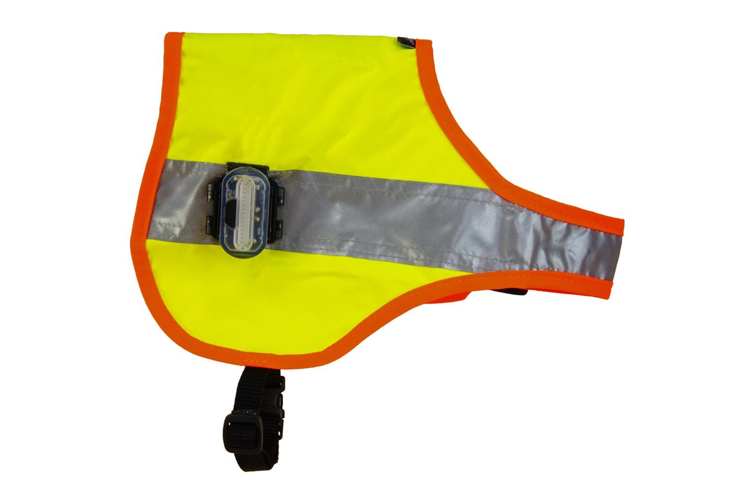 Cette couverture fluorescente jaune avec bande orange est équipée en standard de 2 lampes LED (avec cinq LED jaunes puissantes et piles AAA) et d'un réflecteur de 50 mm (certifié EN20471). La couverture d'identification se caractérise par des sangles ventrales et pectorales réglables en continu. Même les chiens à poils longs sont visibles de tous les côtés. Après le démontage des lampes LED, la couverture peut être lavée à 30° C et le reflet est toujours conforme à la norme EN20471 après 25 lavages.